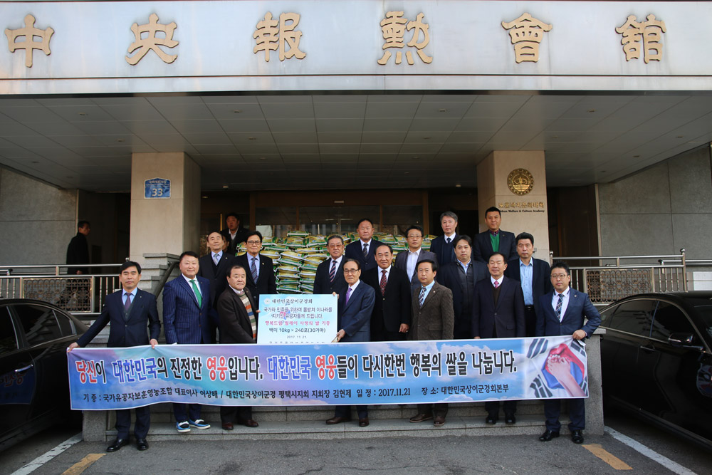 사랑의 쌀 나눔 행사 국가유공자 위주로 형성된 조합인 국가유공자보훈영농조합과 대한민국상이군경회 평택지회는 지난 11월 21일 대한민국상이군경회(회장 김덕남)에 ‘행복드림 릴레이 사랑의 쌀’전달식을 가졌다. 이날 전달식에는 김덕남 대한민국상이군경회 회장, 김현제 상이군경회 평택시지회장, 이상배, 이신국, 우성화 보훈영농조합사외이사 등이 참석한 가운데, 쌀 30가마(10kg×240포)를 전달했다. 김현제 대한민국상이군경회 평택시지회장은 “이 나라를 지키신 유공자들께 도움을 줄 수 있어 기쁘게 생각한다.” 며 “농업경영을 통한 나라사랑 보훈정신으로 국가와 국민을 위한 진정한 봉사자로 앞으로도 지역사회를 보다 따뜻하게 만드는데 앞장 설 수 있도록 최선을 다 하겠다”고 전했다. 국가유공자보훈영농조합에 새로 취임한 이상배 대표이사는 “선배님들을 모시고 명실공히 최고의 유공자법인으로 재도약을 위한 준비를 마쳤으며, 앞으로도 지속적으로 쌀 기부를 통한 나눔 문화가 확산될 수 있도록 노력하겠다.”고 말했다. |