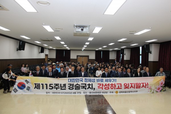 ♣ 제115주년 경술국치일 상기행사 ♣ 울산지부 나호원 지부장은 2025. 8. 29.(금) 11:00 울산광역시보훈회관 2층 대강당에서 열린 제115주년 국권상실의 날 상기행사에 참석하였습니다. 일제가 대한제국의 국권을 강탈한 경술국치를 추념하기 위한 이날 행사에는 강석두 울산보훈지청장, 울산보훈안보단체장, 독립유공자 유가족 등 100여 명이 참석한 가운데 기념영상 시청, 경술국치 연혁 및 경과보고, 대회사, 추념사, 독립군가 제창, 만세삼창 순으로 진행되었습니다. |