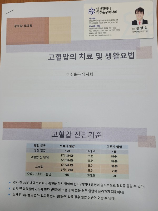 - 건강강좌 : 인천광역시 미추홀구 약사회 회장 김명철 박사 / 고혈압의 치료 및 생활요법