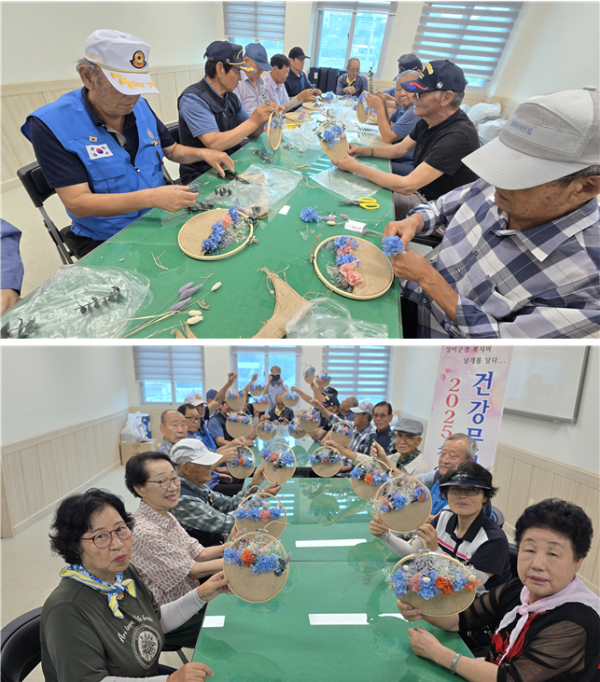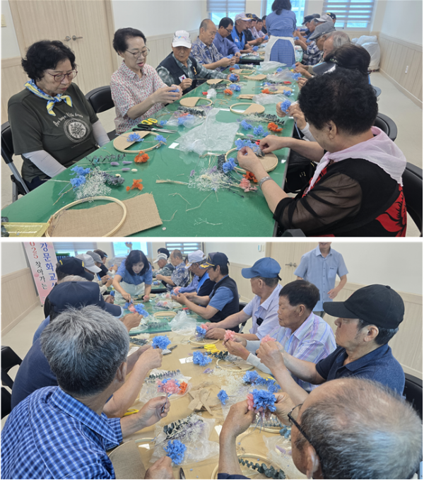 2025 찾아가는 건강문화프로그램 (금산군지회) - 일 시 : 2025. 8. 13(수) 10:30-11:30 - 장 소 : 금산군 보훈회관 - 인 원 : 24명 - 제 목 : 프리져보드 수틀장식 - 강 사 : 신용순(화목플라워) - 내 용 : 수틀에 마천을 끼워 주머니를 만들고 그안에 프리져보드 꽃으로 장식하여 완성 |