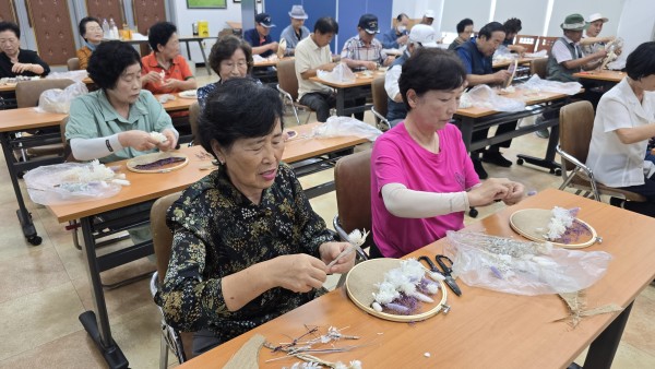 2025 찾아가는 건강문화프로그램 (홍성군지회) - 일 시 : 2025. 9. 8(월) 10:30-11:30 - 장 소 : 충남서부보훈지청 - 인 원 : 24명 - 제 목 : 프리져보드 수틀장식 - 강 사 : 신용순(화목플라워) - 내 용 : 수틀에 마천을 끼워 주머니를 만들고 그안에 프리져보드 꽃으로 장식하여 완성 |