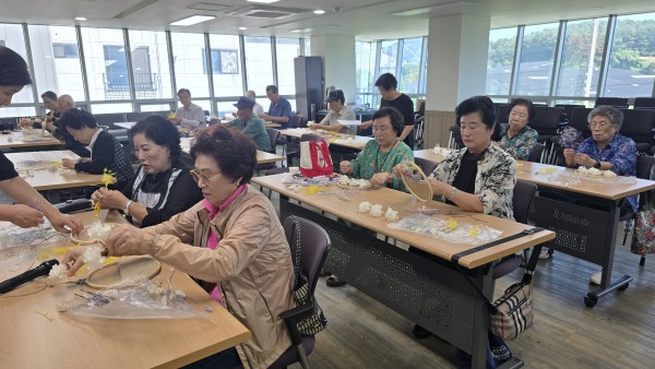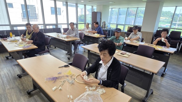 2025 찾아가는 건강문화프로그램 (서산시지회) - 일 시 : 2025. 9. 11(수) 10:30-11:30 - 장 소 : 서산시 보훈회관 - 인 원 : 20명 - 제 목 : 프리져보드 수틀장식 - 강 사 : 신용순(화목플라워) - 내 용 : 수틀에 마천을 끼워 주머니를 만들고 그안에 프리져보드 꽃으로 장식하여 완성 |