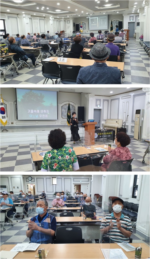 대한민국상이군경회 보훈복지문화대학 대구캠퍼스에서는 상이군경회원분들께 즐거운 여가활동을 통해 영예로운 삶을 살아갈 수 있도록 다양한 프로그램을 제공하고자 노력 하고 있습니다. * 코로나19 방역수칙 게시판 게시 및 시설이용 수칙 안내 입장시 마스크착용 필수, 발열체크 후 손소독 및 출입명부 작성, 마스크 배부 * 일 시 : 2020년 6월 24일(수) 14:00~17:00 * 장 소 : 대한민국상이군경회 대구시지부 복지회관 5층(영대병원네거리 부근) * 내 용 : 우리역사바로알기 - 김정자 문화해설사 * 내 용 : 신바람노래강좌 - 황혜진 강사 |