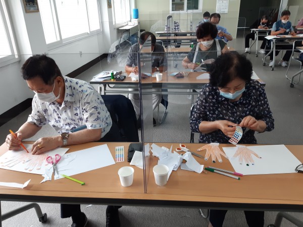 【2교시】 ○ 프로그램 : 인지미술치료 ○ 일 시 : 2020년 6월 23일(화) ○ 강 사 명 : 오수진(지역사회교육협의회 강사) ○ 내 용 : 마음을 토닥이고 싶은 사람 생각하며 손가락 그리기