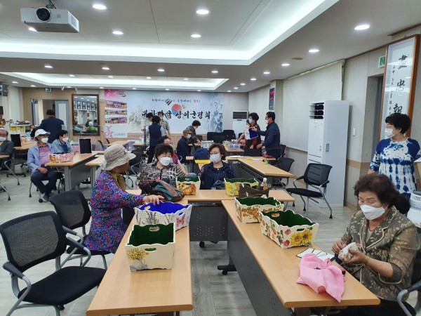 6월17일 수요일 제주캠퍼스에서는 여느날과 마찬가지로 발열체크와 손소독, 마스크를 착용하고 강의실로 들어왔다. 최은숙(로뎀하우스)강사의 지도아래 냅킨공예로 다용도함을 만드는 수업이 진행되었다. 참여자들의 취향이 다양하듯 좋아하는 냅킨을 고르는 모습도 신중해 보였다. 선택한 냅킨을 붙이고 사포질과 유약을 바르는 섬세한 작업이었지만 완성되어가는 모습에 만족해 하였다. |