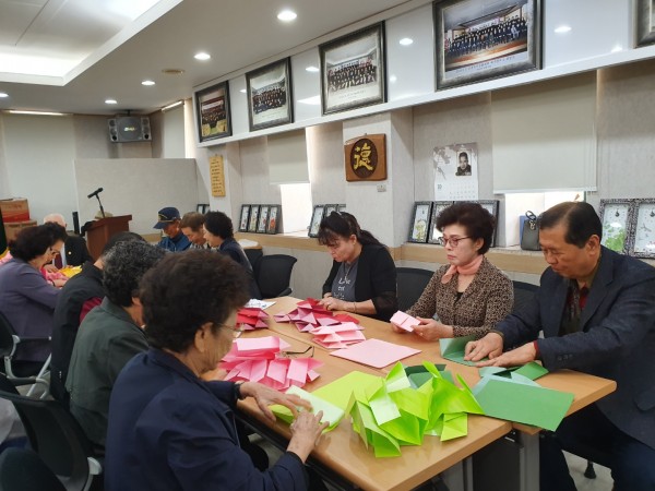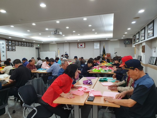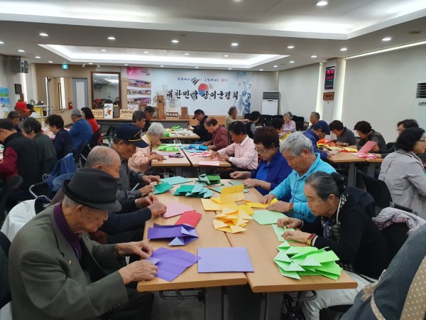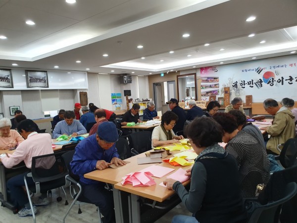 10월16일 수요일은 1,2교시 수업으로 종이공예/각티슈케이스 만들기를 하였다. 종이를 하나 하나 접어서 붙이고 글루건을 이용하여 장식을 붙이는 등 섬세함을 요구하는 수업이었다. 강사의 지도에 하나씩 붙여가며 열과 성을 다하여 만드는 모습이 진지하기도 하였다.