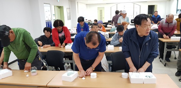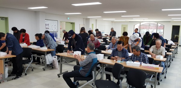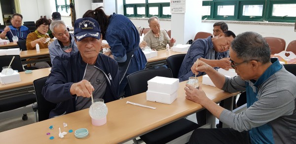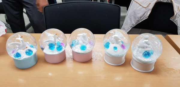 보훈대상자 건강문화교실 ( 스노우 볼 ) - 일 시 : 2019. 10. 8 (화) 12:30-15:00 - 강 사 : 임수민, 김혜란(임수민 도자기) - 제 목 : 스노우 볼 - 내 용 : 점토 찰흙으로 받침을 만들고 학모양과, 곰모양 중 하나를 택해 스노우볼 안에 들어갈 모형을 만들고 가마에 구운후 유리 구 안에 글리세린과 물을 섞고 반짝이를 넣어 저은 후 모형을 넣고 고무마개로 막아 스노우볼을 만듦 |