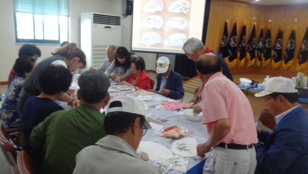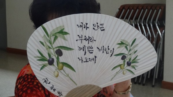 보훈복지문화대학 경북캠퍼스 (학장 이인우)는 2016년 6월 15일 수요일 13:00~15:00 "이야기를 빚는 한 그릇" 수업을 실시 하였다. 이번 수업은 냅킨 그림을 원하는 모양을 골라 가위로 잘라서 부채에 붙이고 "캘리그라피"로 글씨를 그림 그리듯 표현 하는 수업으로 나만의 부채를 만들수 있는 수업이었다. 학생들이 매우 좋아하는 수업으로 다음 수업은 2016년 6월 22일 수요일 13:00 ~ 15:00 에 "캘리그라피 접시 만들기" 수업이 진행 될 예정이다. (작성자: 전자영 사회복지사) |