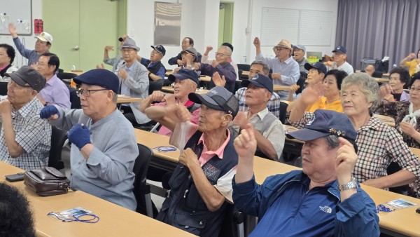 1교시 : 안보역사학 - 일 시 : 2025. 9. 16(화) 10:00-10:50 - 강 사 : 최 미 애(국민연금공단 노후준비팀) - 내 용 : 흥겨운 음악에 맞춰 가벼운 동작들로 경직된 몸을 풀고 웃음의 중요성에 대해 알아봄 2교시 : 찾아가는 웰다잉 - 일 시 : 2025. 9. 16(화) 11:00-12:00 - 강 사 : 정용문, 박옥경(백석웰다잉힐링센터) - 내 용 : 손유희와 건강박수로 뇌를 자극하고, 건강한 인생을 설계하고 삶의 가치와 중요성에 대해 알아봄 ▣ 동아리 수업(북&장구 퓨전난타) - 일 시 : 2025. 9. 16(화) 12:30-14:30 - 강 사 : 이 은 경 - 내 용 : 장구와 전통북을 이용한 퓨전 난타 |