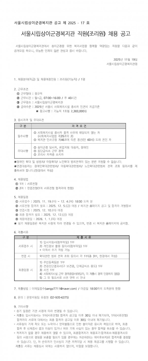 [채용마감] 서울시립상이군경복지관 직원(조리원) 채용 공고