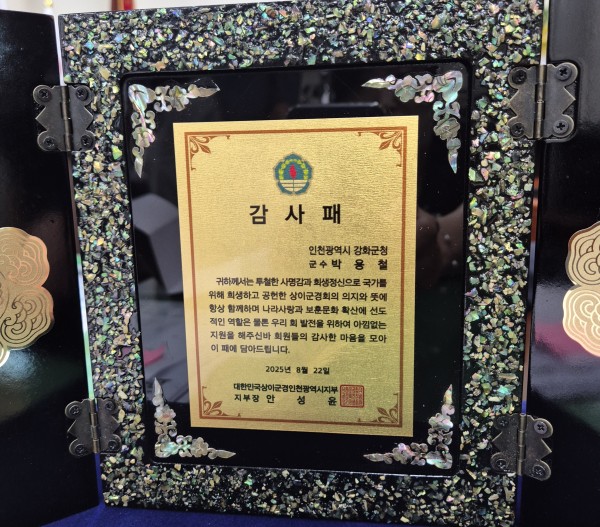 # 장소 : 강화군 보훈회관 3층 회의실 # 참석인원 : 지부장, 지도부장, 강화군 지회장 외 회원 64명 # 내용 : 나라사랑과 보훈문화 확산에 선도적인 역할은 물론 우리회 발전을 위하여 아낌없는 지원을 해주심에 상이군경회 회원들의 마음을 담아 지부장님께서 박용철 강화군수님께 감사패를 전달함. |