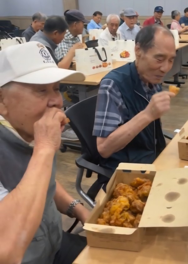 # 내용 : 교촌치킨 50마리를 지원받아 복지회관 이용 회원 100여명이 맛있게 드시며 즐거운 시간을 보내셨다
