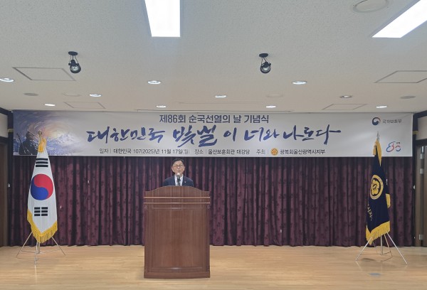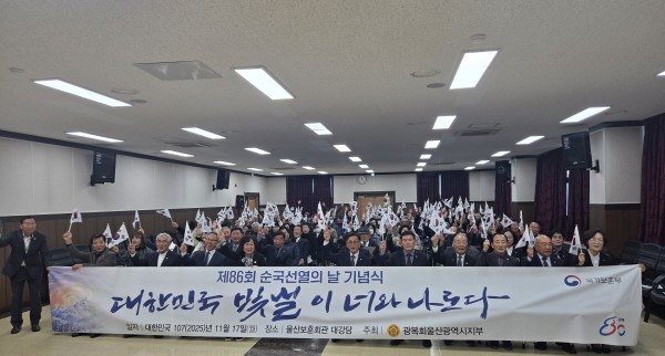■ 제86회 순국선열의 날 기념식 ■ 울산지부 나호원 지부장은 2025. 11. 17.(월) 11:00 울산보훈회관 2층 대강당에서 열린 제86회 순국선열의 날 기념식에 참석하였습니다. 일제에 강제로 국권을 빼앗긴 역사적 교훈을 되새기고, 국권을 되찾기 위해 헌신한 순국선열의 숭고한 애국정신을 기리기 위해 열린 이날 행사는 울산보훈지청장, 울산광역시 보훈노인과장, 보훈단체장 및 광복회 회원 등 100여 명이 참석하여 국민의례, 순국선열과 호국영령에 대한 묵념, 기념사, 추모사, 순국선열의 노래 제창, 만세삼창 등의 순으로 진행되었습니다. |