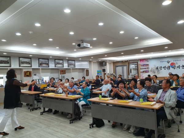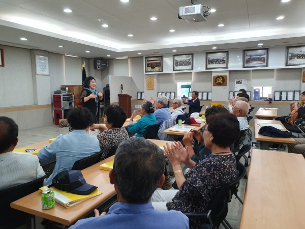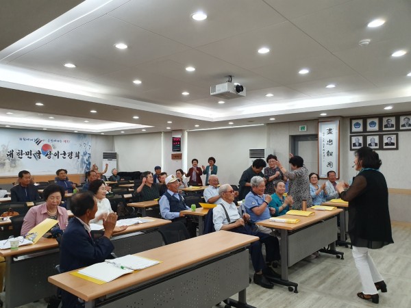 9월18일 수요일 2교시 수업은 10:00-10:50까지 웃음치료 수업이 이루어졌다. 문영희 강사는 스트페스를 해소할 수 있는 방법, 세상에서 제일 사랑받고 소중한 사람은 나, 또나, 바로나, 그래도나 등이라며 참여자들로하여금 자존감을 높여주었다. 수업이 끝날무렵 자리에 앉아있는 모든분들의 얼굴을 즐겁고 행복해 보였다.