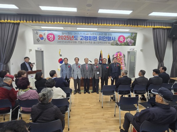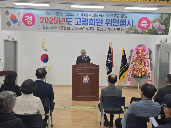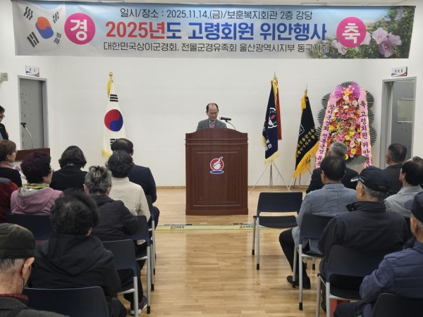 ■ 2025년 동구 보훈2단체 고령회원 위안행사 ■ 울산 동구지회(지회장 이성노)는 2025. 11. 14.(금) 10:30 동구 보훈복지회관 2층 강당에서 2025년 동구 보훈2단체(상이군경회, 전몰군경유족회) 고령회원 위안 행사를 개최하였습니다. 이날 행사는 나호원 지부장을 비롯한 김진술 전몰군경유족회 지부장, 김종훈 동구청장, 박경옥 동구의회의장, 동구의회 의원, 등 보훈 2 단체 국가유공자 및 고령회원 100명이 초청되어 참석한 가운데 내빈소개, 국민의례, 고령회원 축하금 전달, 지회장 대회사, 축사 순으로 진행되었습니다. |