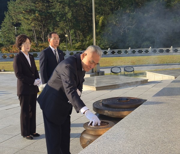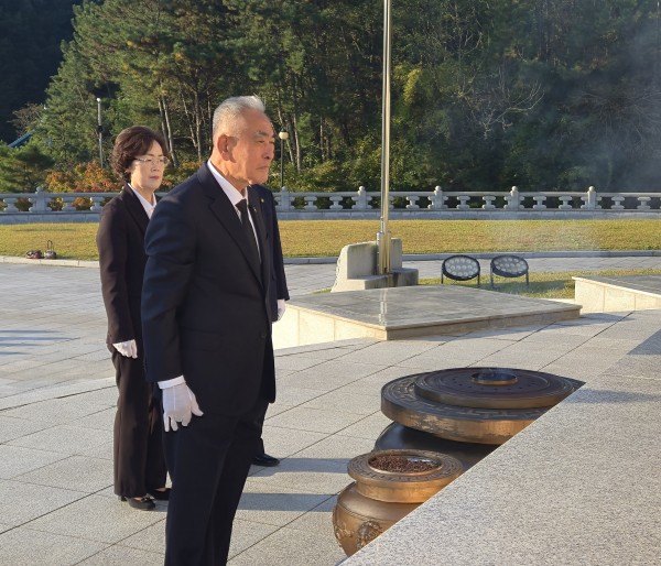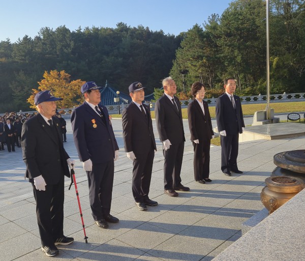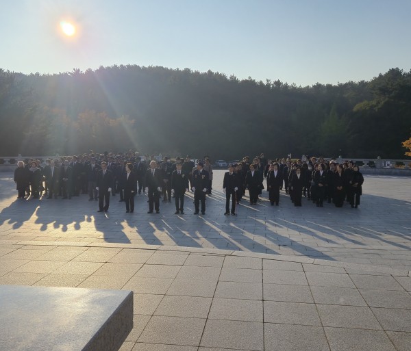 ♠ 11월 현충탑 정기참배 ♠ 울산지부 나호원 지부장 및 직원 일동은 2025. 11. 1.(토) 08:00 울산대공원 내 현충탑 광장에서 실시된 11월 현충탑 정기참배 행사에 참석하였습니다. 이날 행사에는 울산보훈지청장, 보훈단체장 및 회원 등 200여 명이 참석하여 참배를 통해 순국선열과 호국영령의 숭고한 나라사랑 정신을 되새겼습니다.